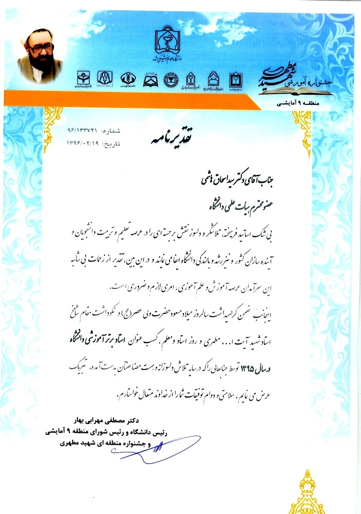 در دهمین جشنواره شهید مطهری از آقایان دکتر هاشمی و پریزاده و سوختانلو تقدیر شد آقای دکتر هاشمی به عنوان استاد برتر آموزشی دانشگاه در سال 1395 انتخاب شده بودند علاوه بر آن، لوح دیگری هم برای ارتقا به رتبه دانشیاری دریافت داشتند. در بخش تقدیر از بازنشستگان هم از آقای دکتر پریزاده قدردانی به عمل آمد. از آقای دکتر سوختانلو هم به خاطر ارتقائ ایشان به رتبه دانشیاری تجلیل به عمل آمد |